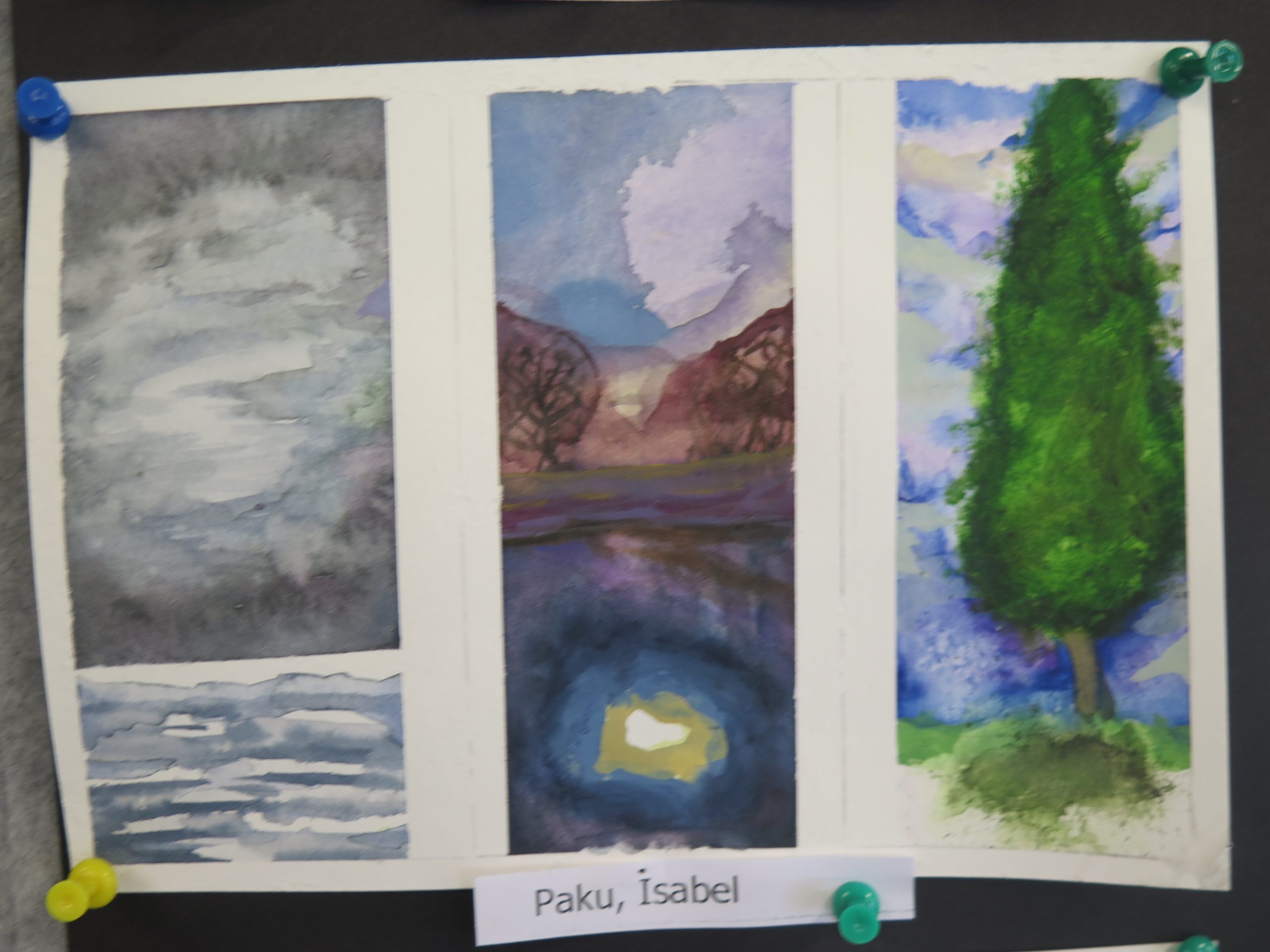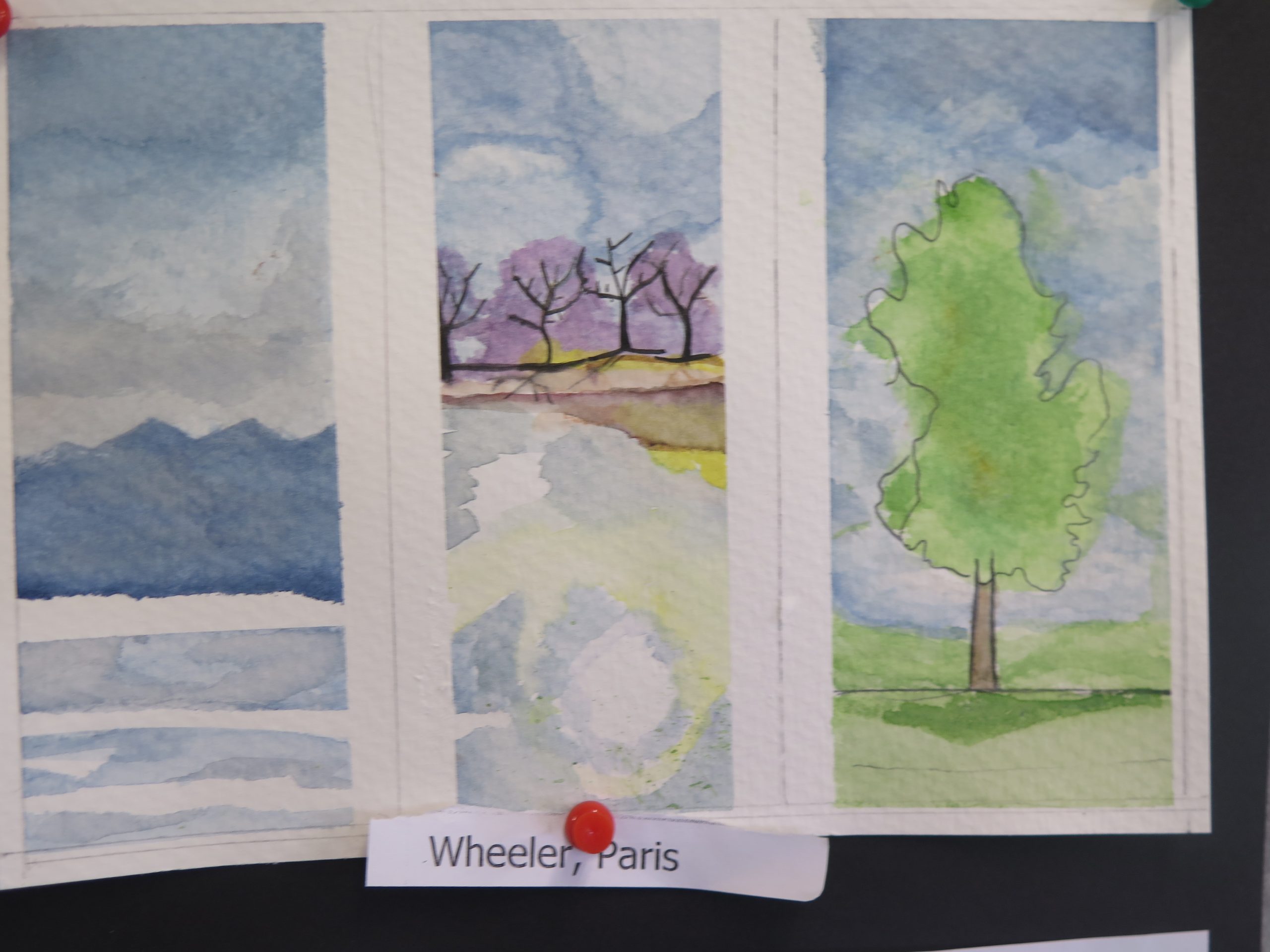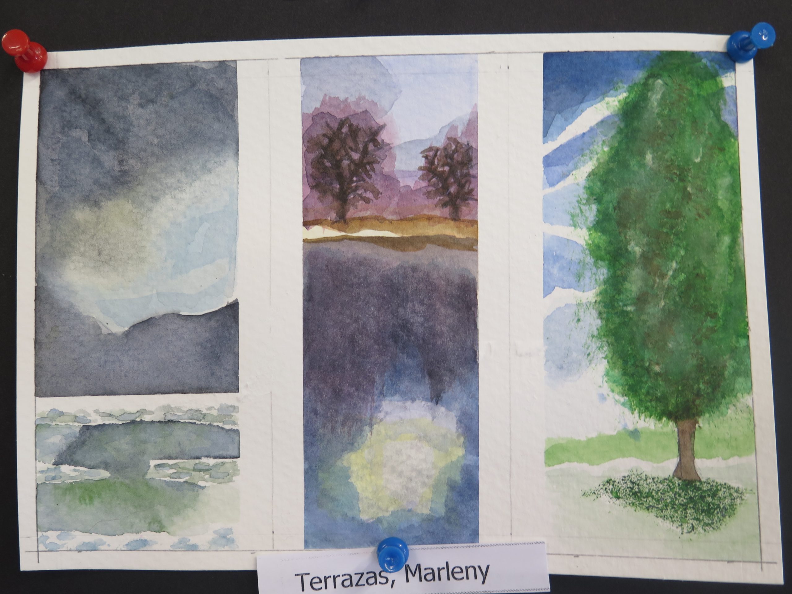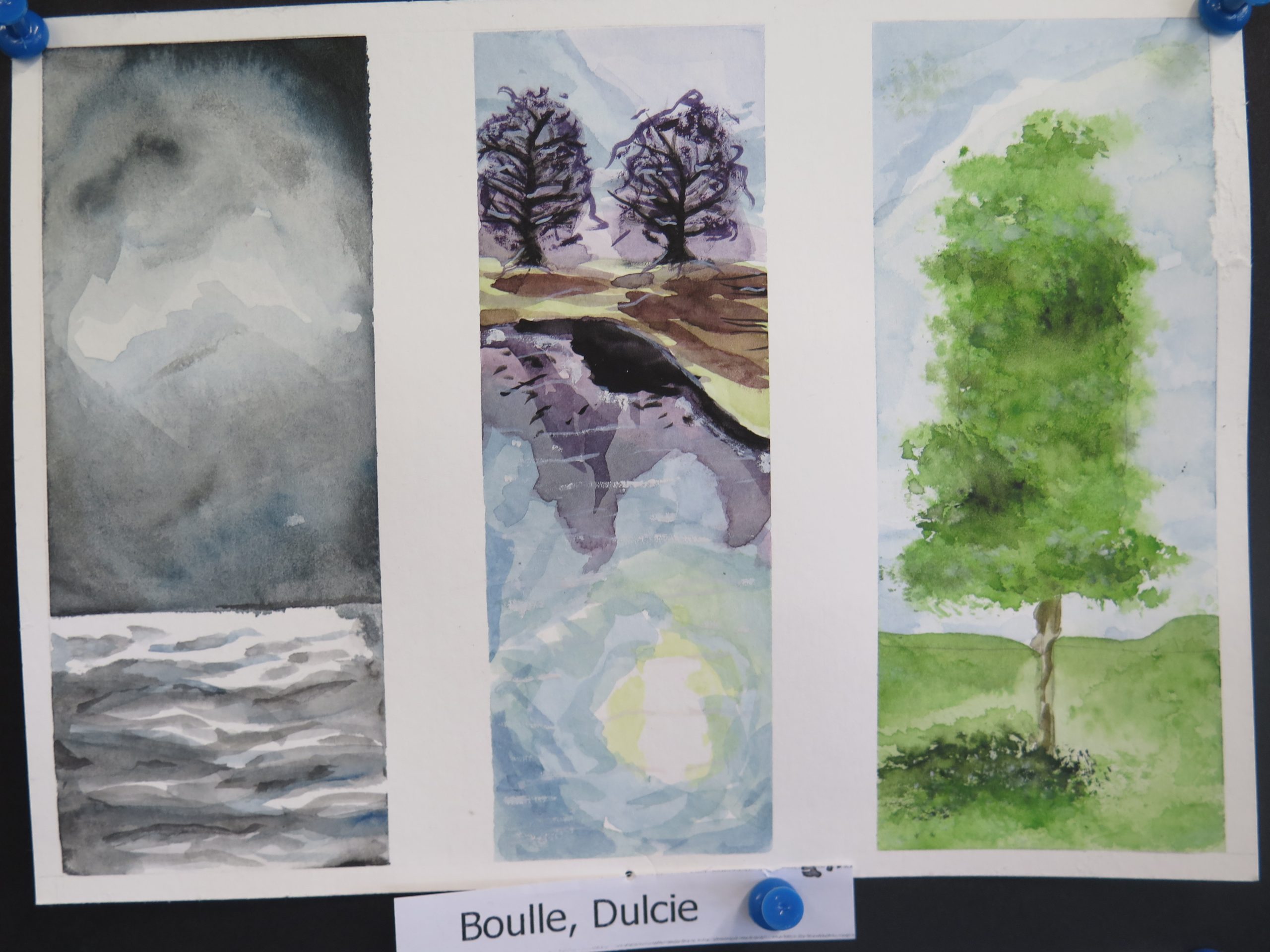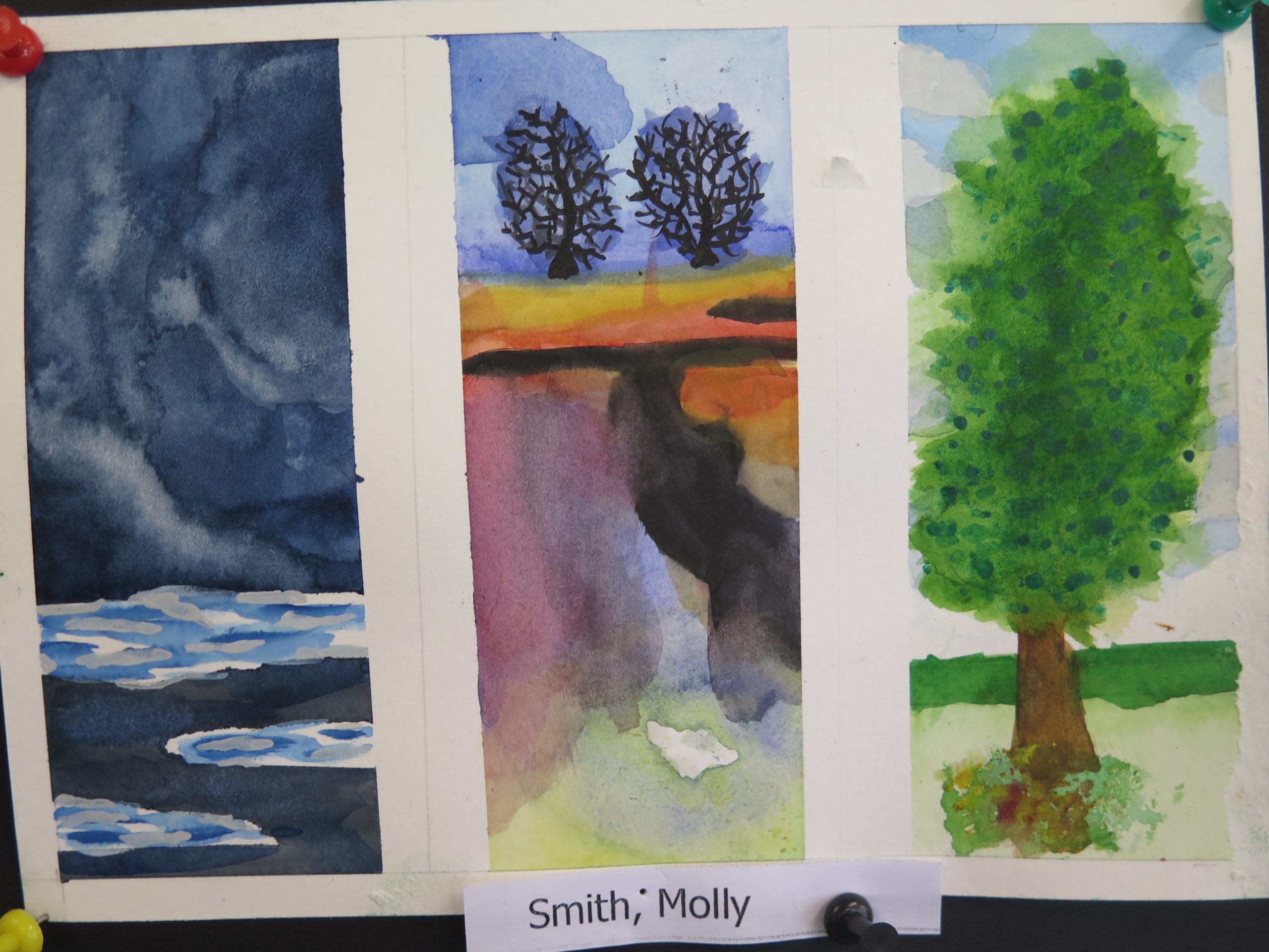 Year 10 Art – watercolour triptych series – are on 300 gram water colour paper and show students’ water colour experiments with different aspects of the landscape, trees, clouds and water reflections.
