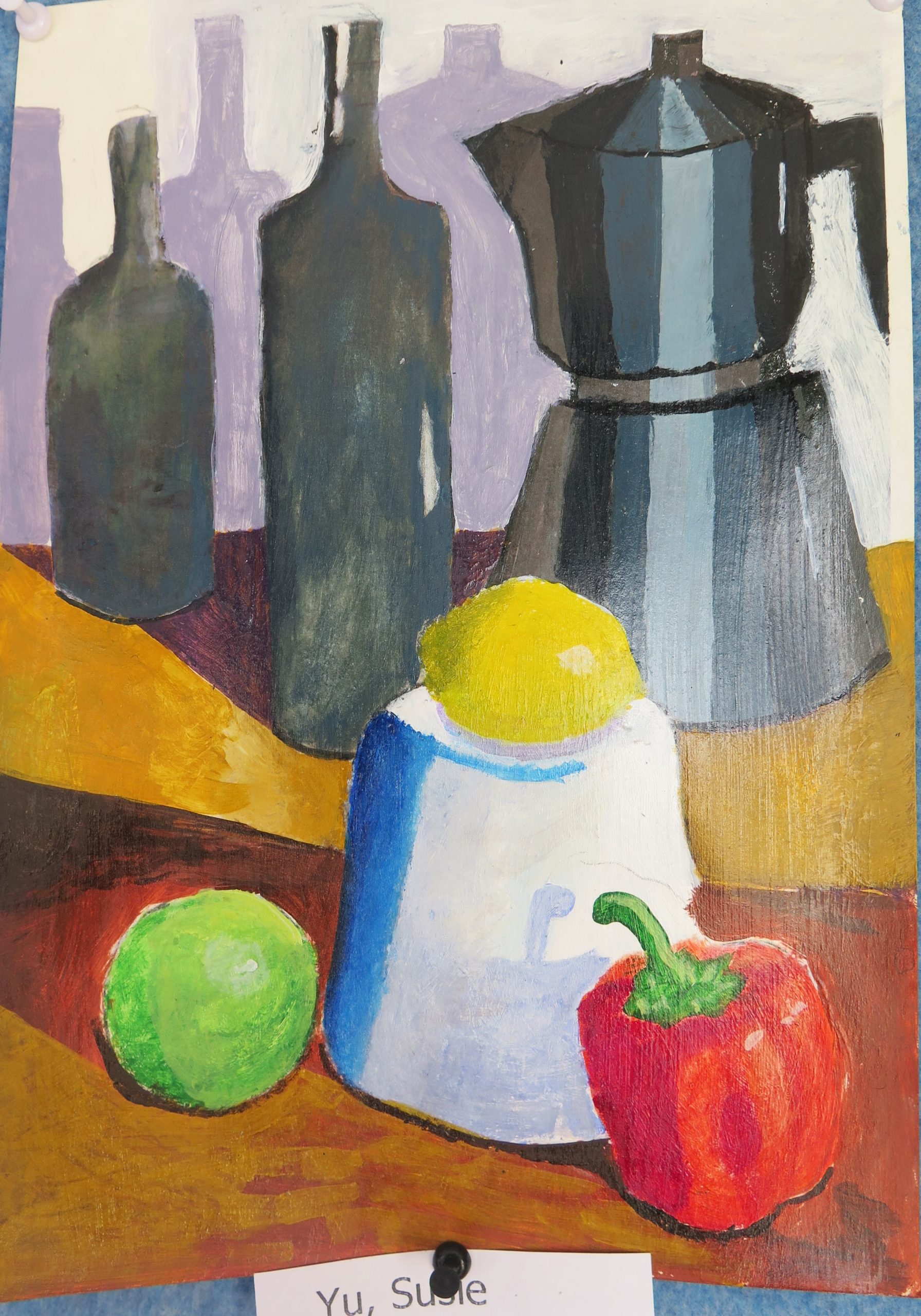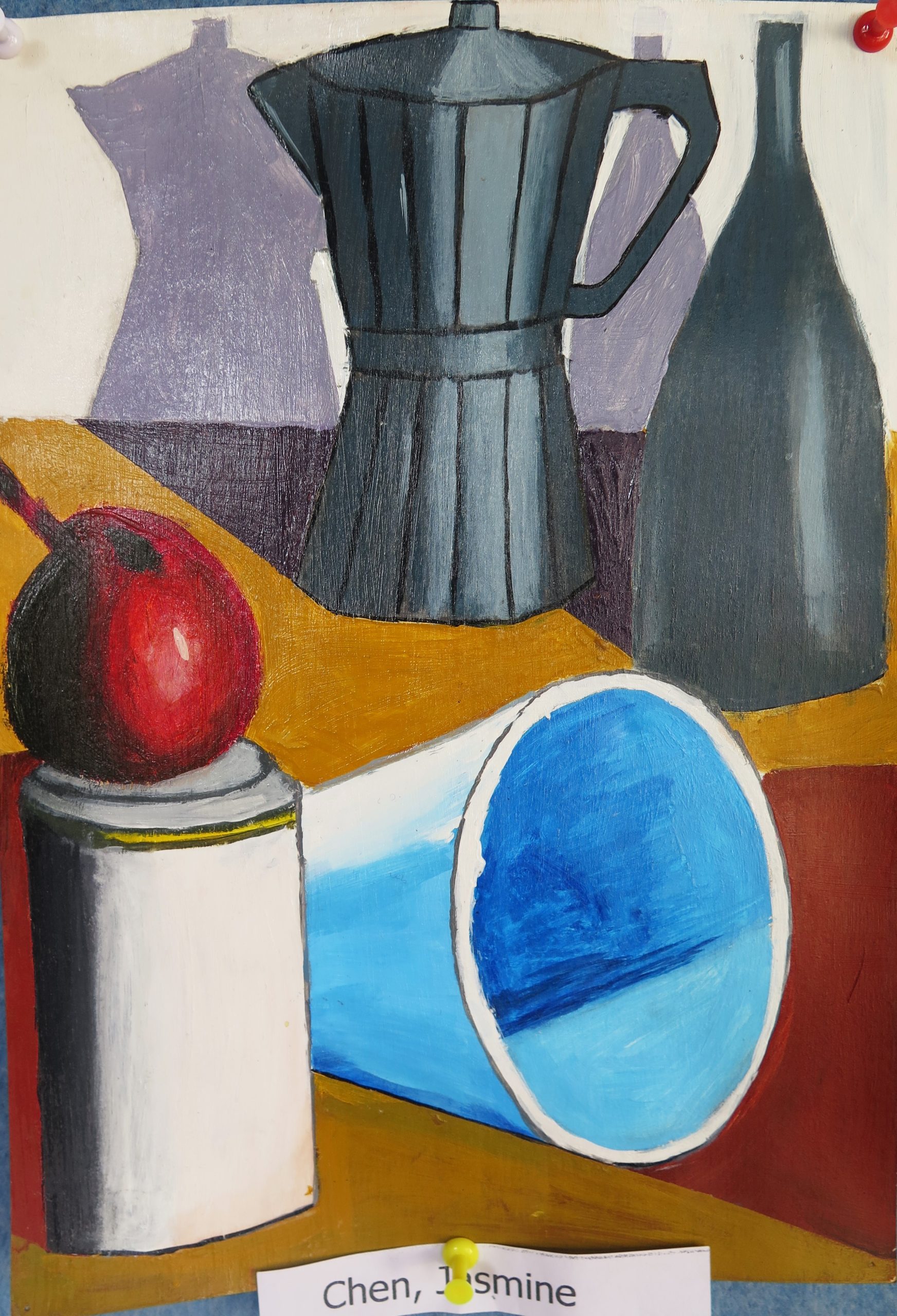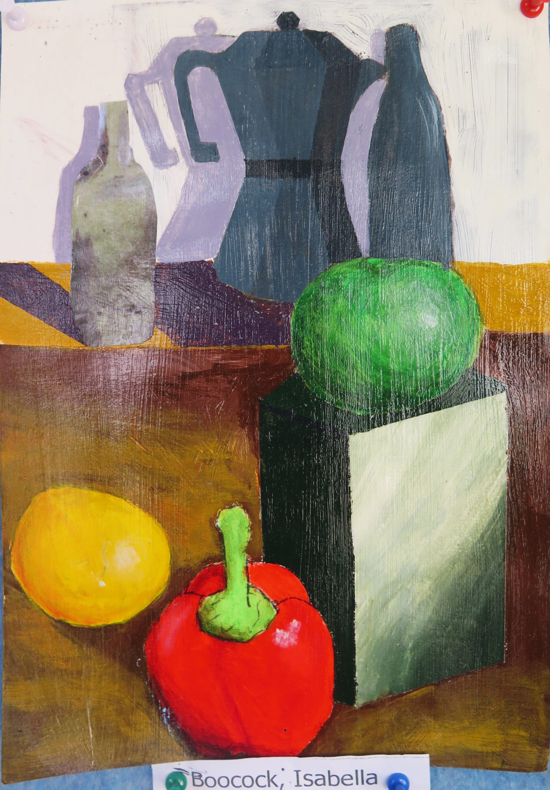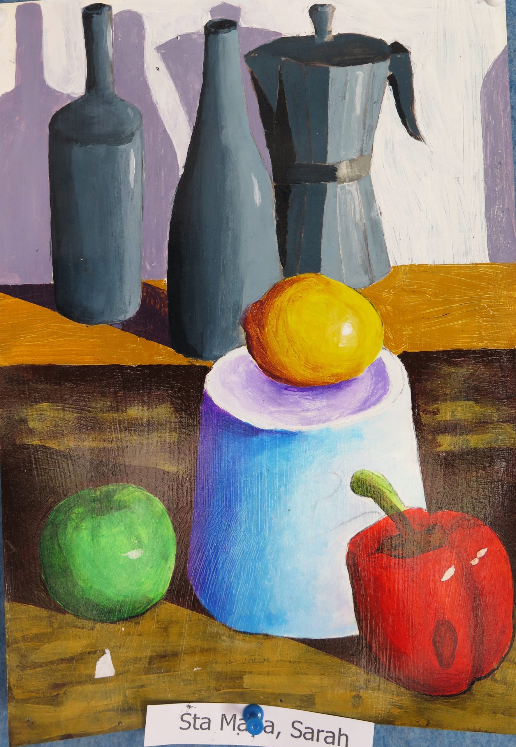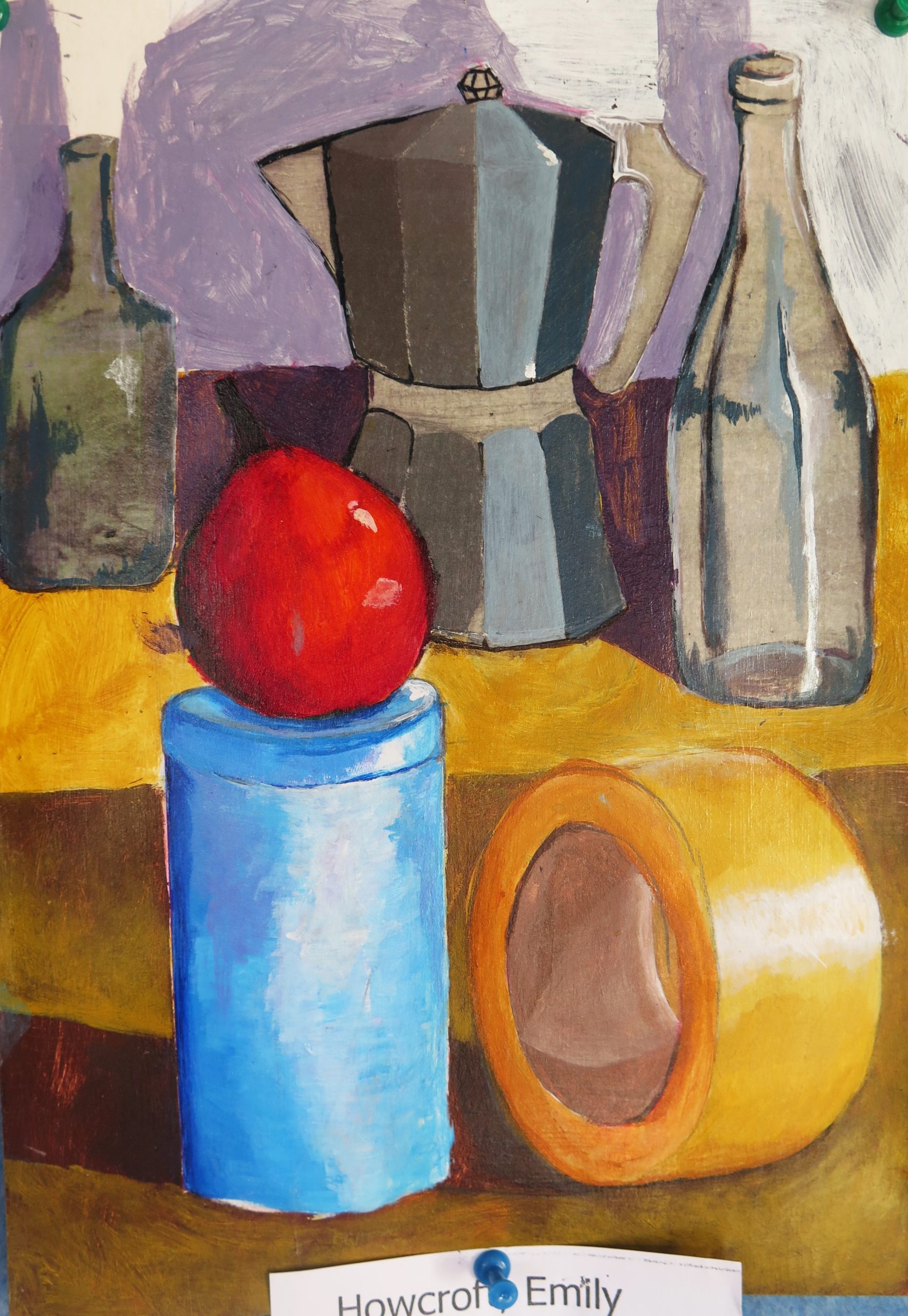 Year 10 Art – still life paintings – are in acrylic paint and are highly varnished. They show the students’ ability to paint simple geometric forms in a wide range of tones in dramatic lighting and limited colour.