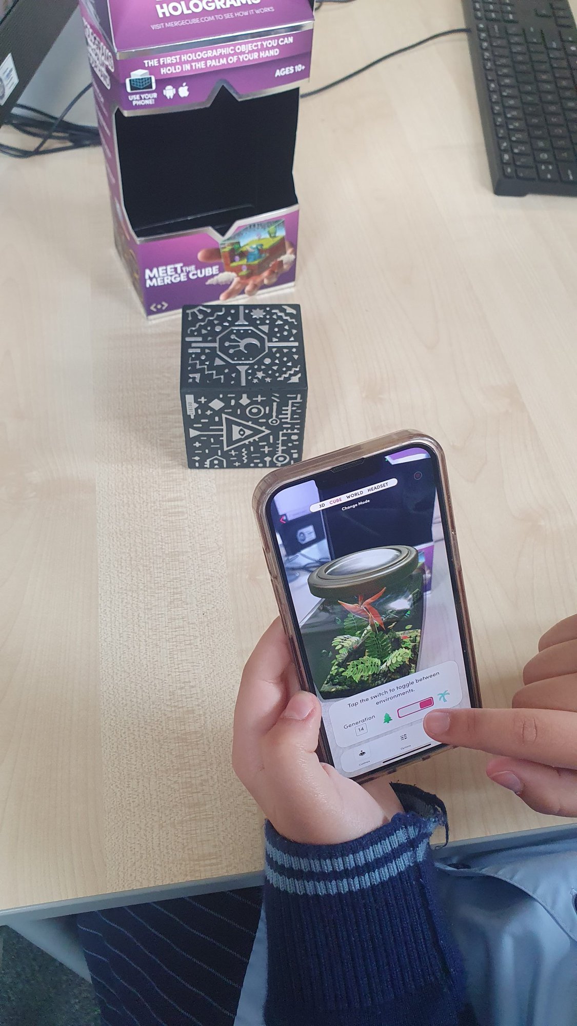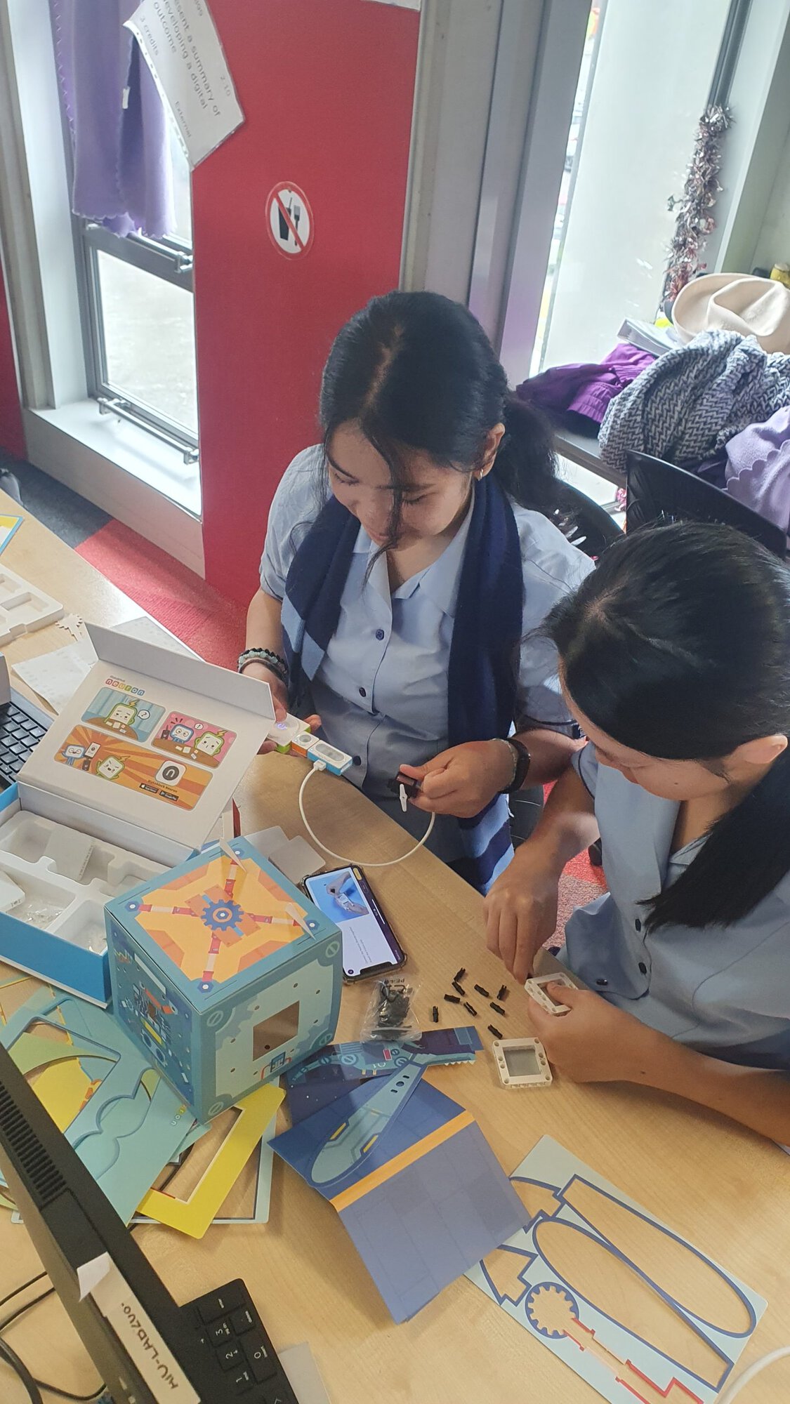 Isabelle is dismantling a broken chromebook. Angelene and Jordin are building an electronic piano with makeblock and Angela is trialling augmented reality with a merge cube.